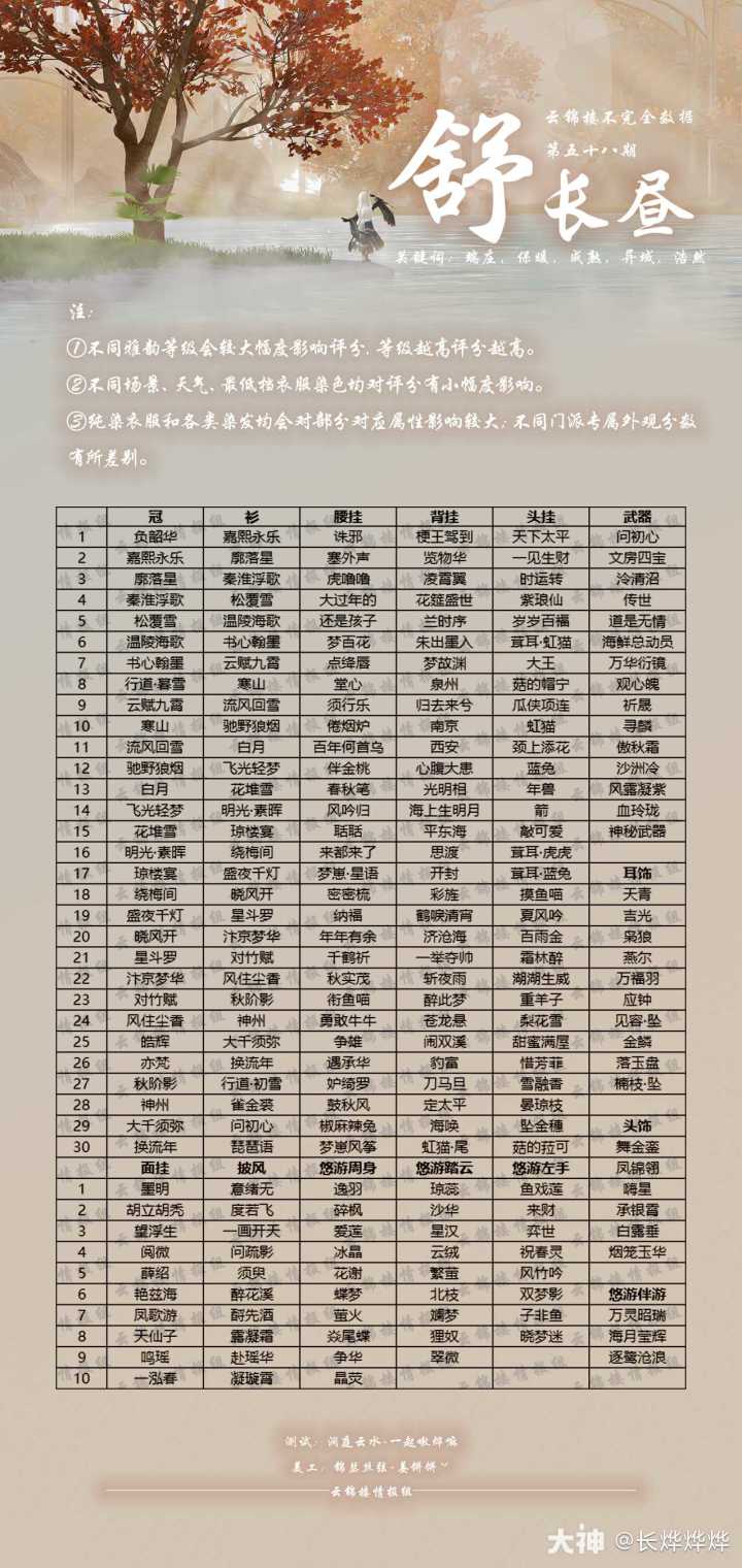 【云锦之争——舒长昼篇】投票赛第五八期 相关属性:端庄·保暖·成熟·异域·浩然攻略范围:冠235+衫218+腰挂119+背挂152+头挂81+武器22+面挂23+披风20+周身13+踏云9+左手8+伴游3+耳饰22+头饰6,共931件。——转载于长烨烨烨