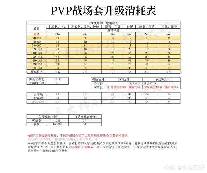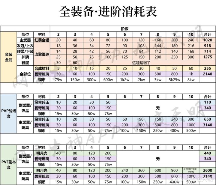 金装&PVP战场装升级和全装备进阶消耗表——转载于一梦江湖小助手