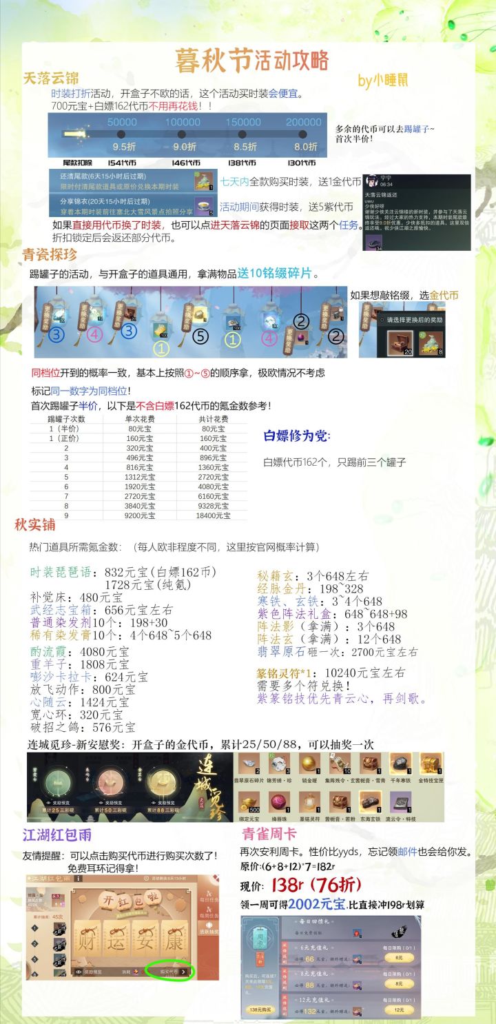 暮秋节活动攻略!天落云锦、青瓷探珍、秋实铺、连城觅珍氪金参考来了——转载于小睡鼠
