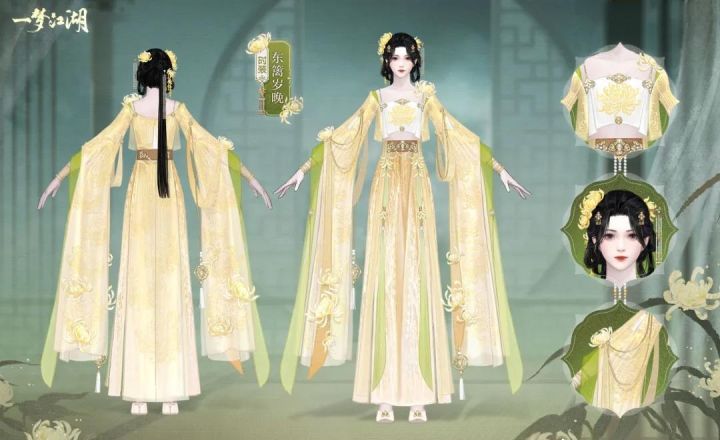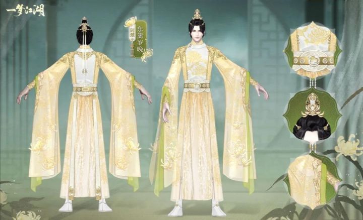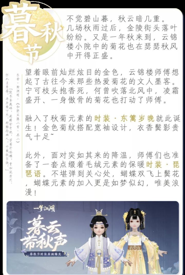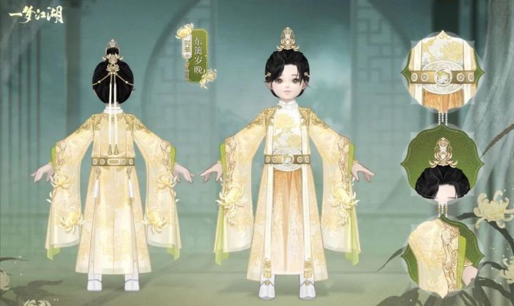 【酒馆告示张贴处——换季新时装抢先看】时装·东篱岁晚以金白配色为主,雪白的前襟上绣着金色菊纹。——转载于嗷呜江湖酒馆