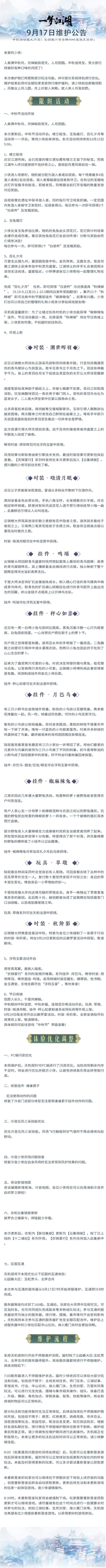 9月17日更新公告!中秋活动盛大开启,全新玩法等你体验~★衣锦宴行系列首套稀世时装·溯世晖羽上线,丝滑飘逸、打造绝美造型!★时装·晓清月眠华美登场,将桂香秋意藏于衣袖之间~★可爱鸟雀挂件月巴乌与两款兔兔挂件来袭,活泼灵动、萌翻江湖!★玩具·草墩系列现身江湖,猜猜看,路边那丛是亲友还是小草?★衣柜内联动集册更新为云集锦册,衣锦宴行加入其中~此外,本周天机阁也针对PC端闪退、泠音见风三采技能等内容进行了优化调整——转载于一梦江湖手游