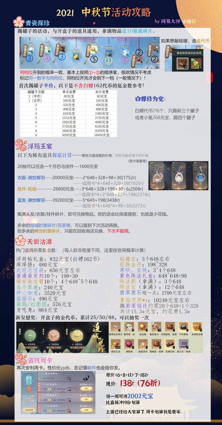 2021中秋节活动攻略!浮筠玉宴、青瓷探珍、天街沽酒、连城觅珍热门道具氪金数计算来了!!这次稀世比起之前的还算便宜了,不过29号还有活动,可以先观望一下!——转载于小睡鼠