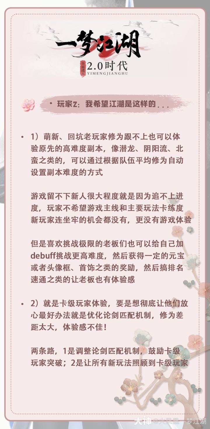 【今日江湖头条】这是你希望的《一梦江湖2.0》吗P1-2 没别的,希望糊糊推出的2.0版本、副本赛季制、新的玩法等,能考虑广大卡级玩家,而不是封死卡级的退路,变向强制卡级突破登峰造极方面的任务就对卡级是否不友好,特别是卡级结义,拿头像框基本不可能,换挂件需要累计三千积分也很难。我的亲友很多都是卡级玩家,版本更新可以,希望糊能好好做,考虑大众玩家的同时也别忘记卡级低修