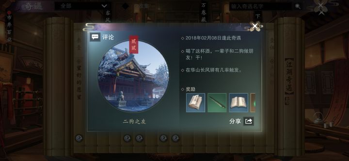 奇遇:二狗之友概述:喝了这杯酒,一辈子和二狗做朋友!干!地点:华山触发条件:在华山长风驿有几率触发奖励:天命纸筏、经验、铜钱等。