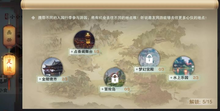 天机阁与应天府共同为少侠们举办的一梦江湖游乐园开张啦!小伙伴们快背上小书包来忆梦游园一起玩耍吧!在游园开始前,所有少侠都会收到一张地图,上面标注了本次游乐园开放的几个玩耍项目,而少侠们要做的就是通过在游乐园中逐个解锁这些足迹,即可在地图上盖章打卡,悄悄的告诉你:集齐打卡有奖励哦!在游园中,小伙伴们可以选择独自出行,或者拉上好友整理好小背包一同出行,有更大几率去往心仪的地点哦! 那么如何决定去
