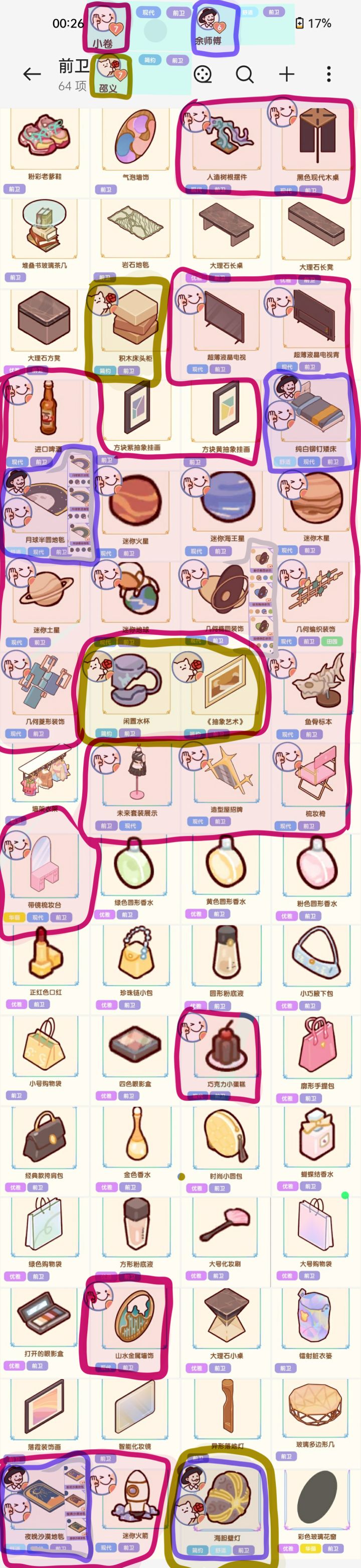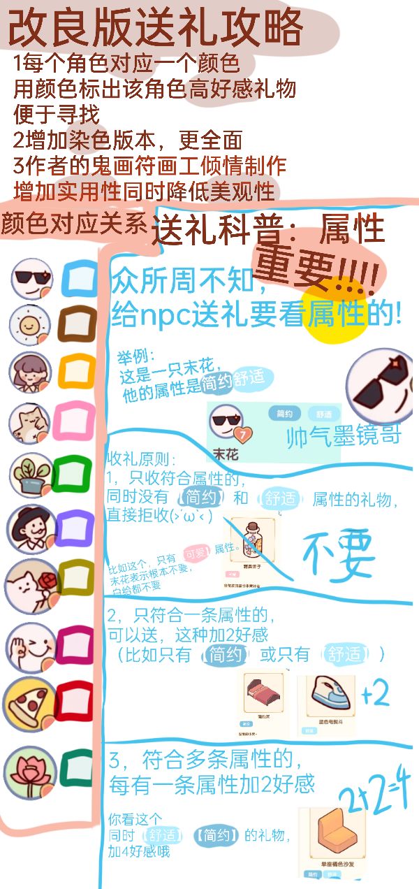 ①使用方法••满足一个属性即可收礼,两个属性双倍好感,由此做出了送礼的属性图鉴~使用方法:1,每页最上边的人物,表示可以接收下面这些礼物并加好感的。2,礼物图片上标注角色头像(并被用该角色代表色框住),意味着这个礼物同时满足此npc多个喜爱属性,送这个礼物给他,好感度加4~63 礼物旁边列出染色后模样,因为其实同一种礼物,你染成多个颜色,然后每个颜色都可以送一次。4,可以把他当成送礼任