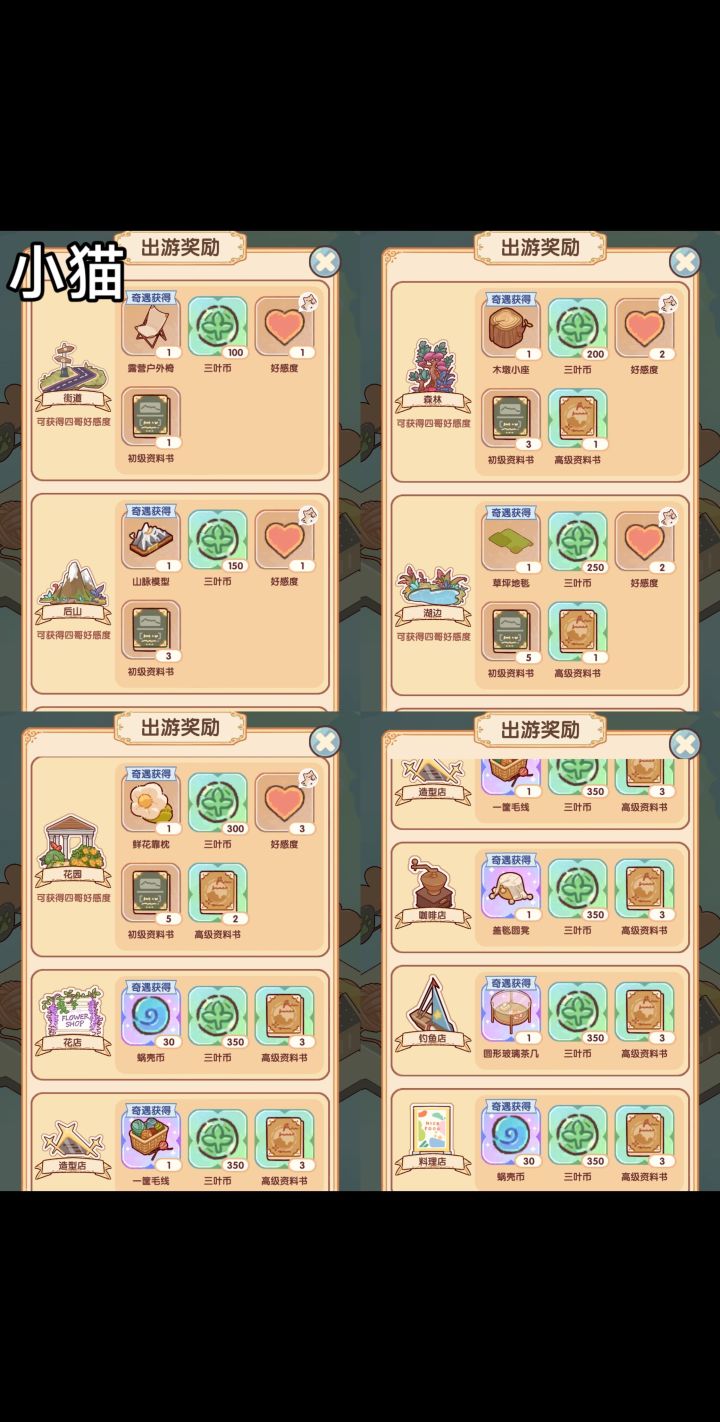 图1~图5∶宠物出游,小镇的和郊外的,猫狗分别能带回来的对应物品。图6~图7∶NPC好感度等级好礼ps∶图片来自官方和tap用户,只有最后一张图是我截得。收藏得太多,发个动态好找些,还是集齐的内容#我的休闲时光 #我的休闲时光攻略 #我的休闲时光蜗居物语 #游戏日常