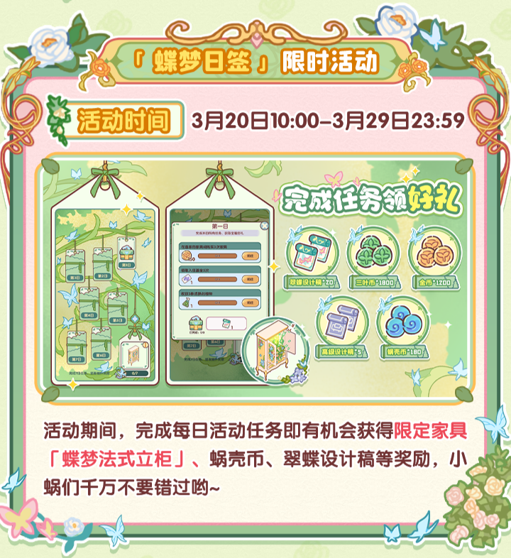 蝶梦日签开启,大家提前准备一下吧~不得不说,这个帘子跟画架真的是绝美!!顺便附上本次活动的兑换码:翠蝶轻舞绘繁花#我的休闲时光 #我的休闲时光创作官 #我的休闲时光攻略 #我的休闲时光兑换码 #我的休闲时光礼包码