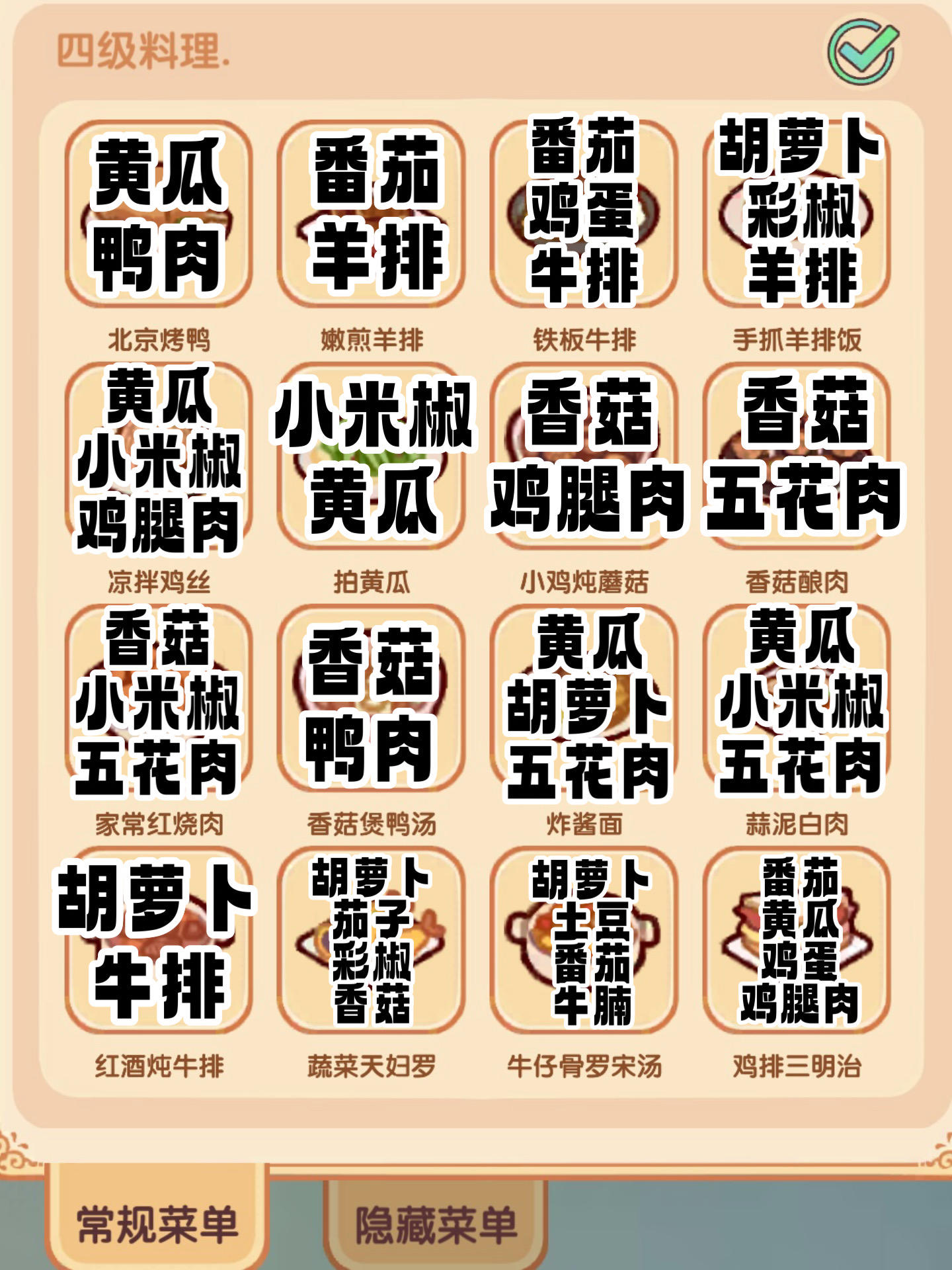 我的休闲时光新手篇攻略✔️包含1级到4级到料理,以及20道隐藏料理菜单的对应配方,一口气把60道菜做光光#我的休闲时光 #我的休闲时光创作 #我的休闲时光我的休闲时光