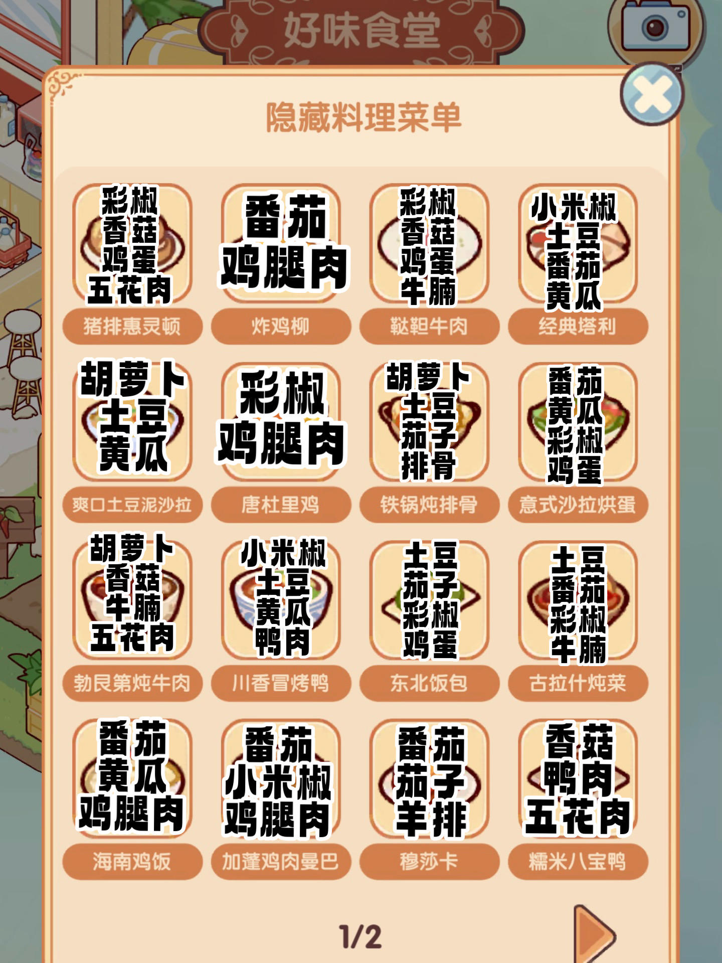一级料理——————————黄金薯条:土豆番茄蛋花汤:番茄,鸡蛋番茄牛腩:番茄,牛腩咖喱土豆牛腩饭:土豆,牛腩二级料理————————当红辣子鸡:小米椒,鸡腿肉糖醋排骨:排骨萝卜煨排骨:胡萝卜,排骨什锦土豆饼:土豆,鸡蛋,胡萝卜照烧鸡肉饭:鸡腿肉排骨焖饭:土豆,番茄,胡萝卜,排骨红烧牛腩:土豆,牛腩,胡萝卜,小米椒清炒胡萝卜片:胡萝卜三级料理——————————炸茄盒