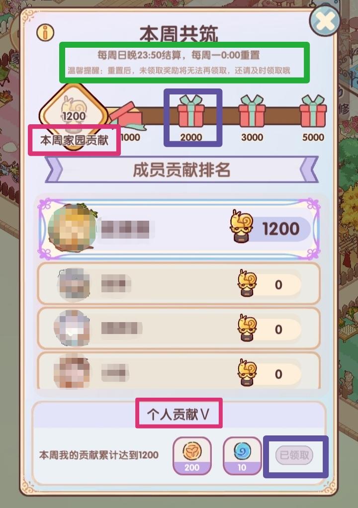 #我的休闲时光 #我的休闲时光蜗居物语 ✦家园共筑为2.7版本的内容。从家园里最多一周获的250个蜗壳币,具体数值和家园等级和总贡献有关。(整体获得蜗壳币数量=周日领家园福利+达标随时领本周共筑)✦本周共筑的奖励是本周家园贡献+个人贡献(粉色方框),它的领取时间和过去版本相比更灵活,只要达到对应数值即可获得奖励,可以立刻领取,不需要等到周日。以本小蜗为例,周一早8点就贡献到1200了,那个人贡