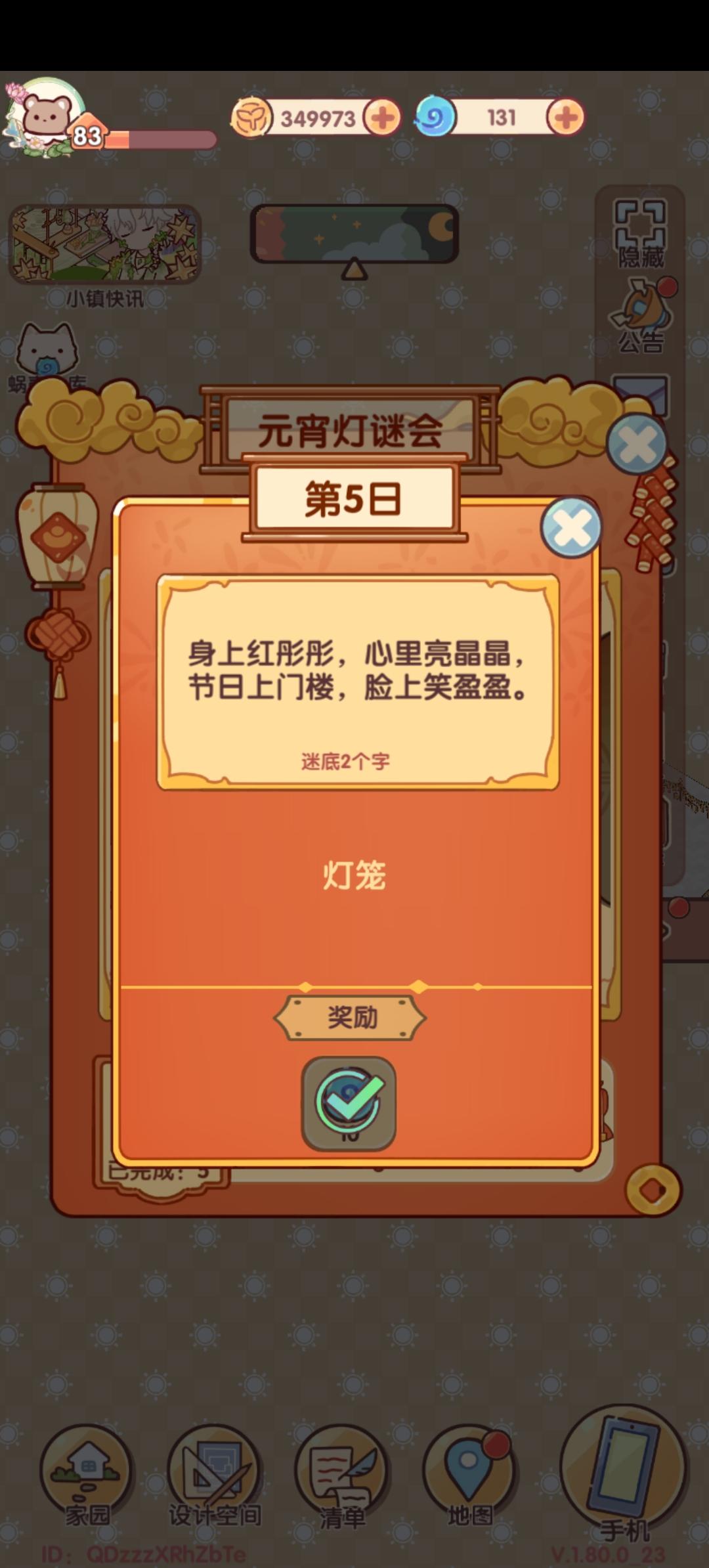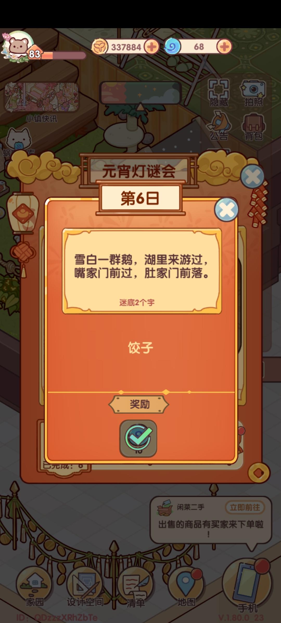 1️⃣元宵灯谜会2月7号上线,共六天2️⃣答对灯谜获得设计稿和蜗壳币奖励,共四张设计稿🏮答案持续更新中#今天游戏圈发生了啥 #我的休闲时光 #活动预告 #装修 #我的休闲时光蜗居物语 #我的休闲时光创作官 #攻略