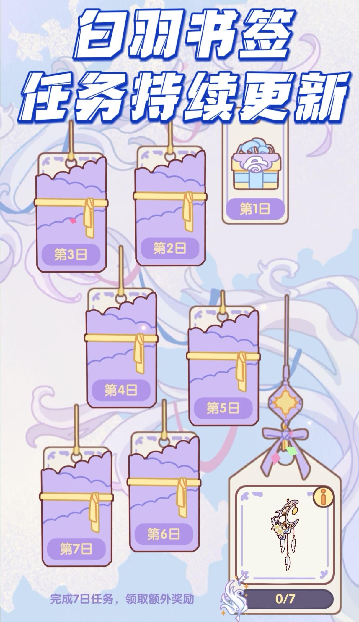 1️⃣完成每日任务获得白羽设计稿2️⃣七天任务全部完成获得白羽挂件✅任务在活动期间内完成即可,每日任务不会刷新,不需要当天任务当天做完。🧩每日任务持续更新中,大家可以提前做好准备#我的休闲时光 #我的休闲时光创作官 #我的休闲时光蜗居物语 #游戏种草计划 #爆料 #装修