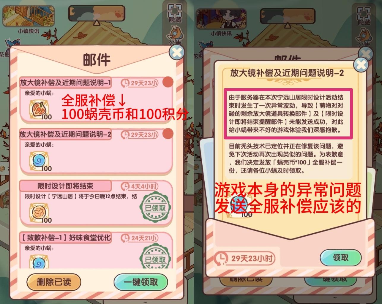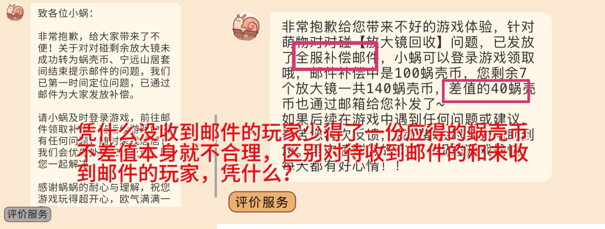 ✦我就想问一句凭什么利用补差值的方式来处理本就没有收到邮件玩家的补偿?✦已经收到邮件的玩家获得了原本应得的蜗壳币+全服补偿,而因为游戏本身异常问题的没有收到邮件的玩家得到的却是差值+全服补偿?我是有2个放大镜,比较少,40个;但有玩家是7个放大镜,人家应得的140个最后变成了40个,还是你游会做游戏呀~为什么?请把因为游戏异常没有收到邮件的玩家应得的全部蜗壳币返还给我们,凭什么游戏的错误玩家买单