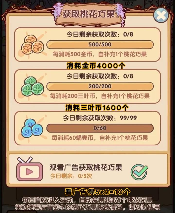 #我的休闲时光蜗居物语 #我的休闲时光 新的限时套间活动来了,全部过关累计获得11张设计稿和200+蜗壳币玩法就是获得桃花巧果击碎面块,获得对应物件,赢得过关奖励。①获得桃花巧果:(不消耗蜗壳币)一天能获得8+8+10+5=31个②击碎面块:跟着 @桃子992 大佬玩家的攻略走,明确不同方案之间的不同点,利用不同点快速确定击碎方案,节省桃花巧果过更多的关卡。③数据总结:(不用蜗壳币/零氪