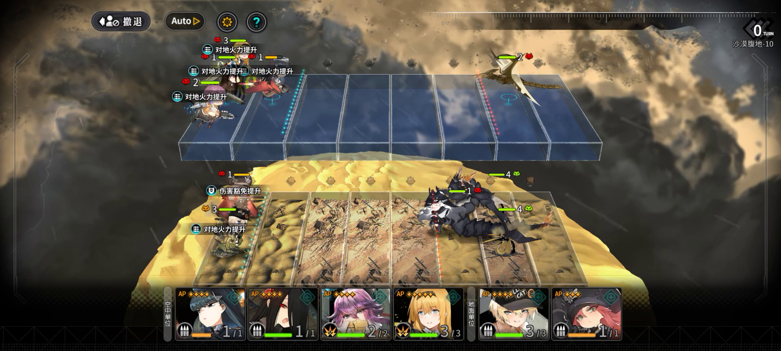 啊,其实感觉有点多余了不过还是发出来好了。这是阵容,应该都有吧,地面就是歼击车或者具有歼击车功能的坦克,等级的话互相弥补吧,地面等级高了天上的要求就低了,唯独有一个不能变的就是天上要有一个5行动力且带有侦查技能的轻型战斗机,啊也就是上面那个二星,天上那个轰炸机基本没用,就是给空中火力buff的。第一回合,空中位置就到这里,轰炸机开一下加空中火力的biff这个技能,攻击机能在这个位置打到地面的就