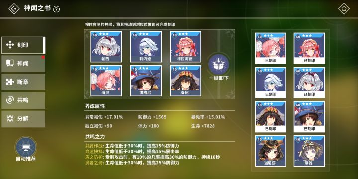 当你看够了大佬们千篇一律的樱花一刀流和增伤三件套后,发现自己想点防御却没有模板,没关系,这里总有一套防御神闻共鸣(包括回血神闻)适合你(这里只讲刻印后能有四个共鸣效果的组合)·方案一:秦珂、莉内娅、帕西、梅拉海德(这四个必带,之后再挑两个神闻刻印)共鸣效果:①盾之防护:受到攻击时有10%几率提升30%防御,持续10秒②并肩作战:Hp<30%时,提升15%防御③命运抉择:Hp<30%时