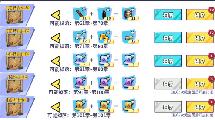 以下是带钥匙的藏宝图碎片的章节:特级:101+终极:100 96 93 92王者:89 87 84 81禅师:78 73 72宗师:70 67宗师前面的都不出红装(最高橙装)61章前面的不出红装,61章后面(包括61章)都有概率出红装章节,越高越容易出藏宝图最好囤到周一统一开,因为会有双倍金币#召唤与合成