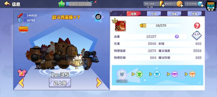 物强转化建议拉满,我一开始片面的拉满魔强转化,发现普通最后一关1w+的魔强白鸡根本打不动,后来攒了一个星期7900+的物强白鸡,配着橙色爆炒轻松打过,当然,也是看了一位大佬的分享,偷偷合了个红鸡出来😜(如图3),精英更不用说了,好多关底魔防转化228%的伙伴直接让你放弃治疗😂