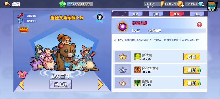 还有就是肉盾家族,我一开始用了很久大力,用近反去处理精英最后几章很肉的boss,到最后这关boss打了两天都没过去,巧的是,刚刚看了一位大佬的帖子,说把幸运点满的拆迁很好用,重点,点满!然后我就动动小手用了仓库里500+的熟练度大礼包把它给拉满了,再穿上我脱了好久的魔强装,锤子击飞杀伙伴,双橙鸡开大,拆迁开大,轻松过。