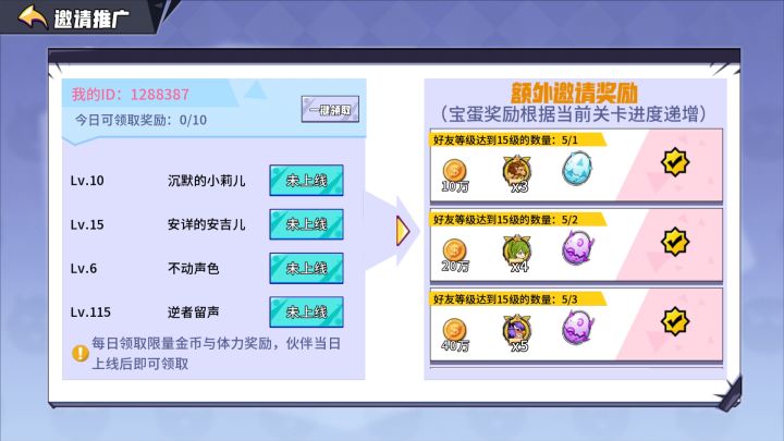 各位萌新看看,最新的暗码,邀请码可以填 121603843 每天领取10+体力和10w金币