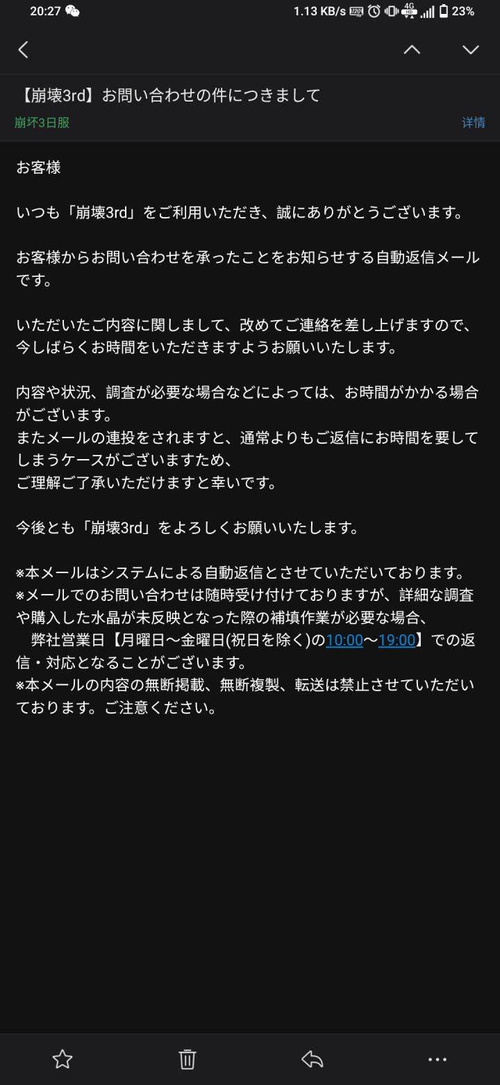 崩坏3日服客服邮箱:3rd_support@mihoyo.co.jp括号内为中文翻译不用复制账号丢失需要先给客服发邮件 邮件内容例如:アカウント紛失(账号丢失)客服会自动回复这样一个邮件QQ邮箱自带翻译功能,就算是机翻也能看懂,上面的这个邮件就不翻译了之后客服会发一个这样的邮件(非常感谢客户总是使用“崩坏3rd”。关于询问的事情,请允许我在这里进行调查。那么,关于到目前为止玩过的账号,