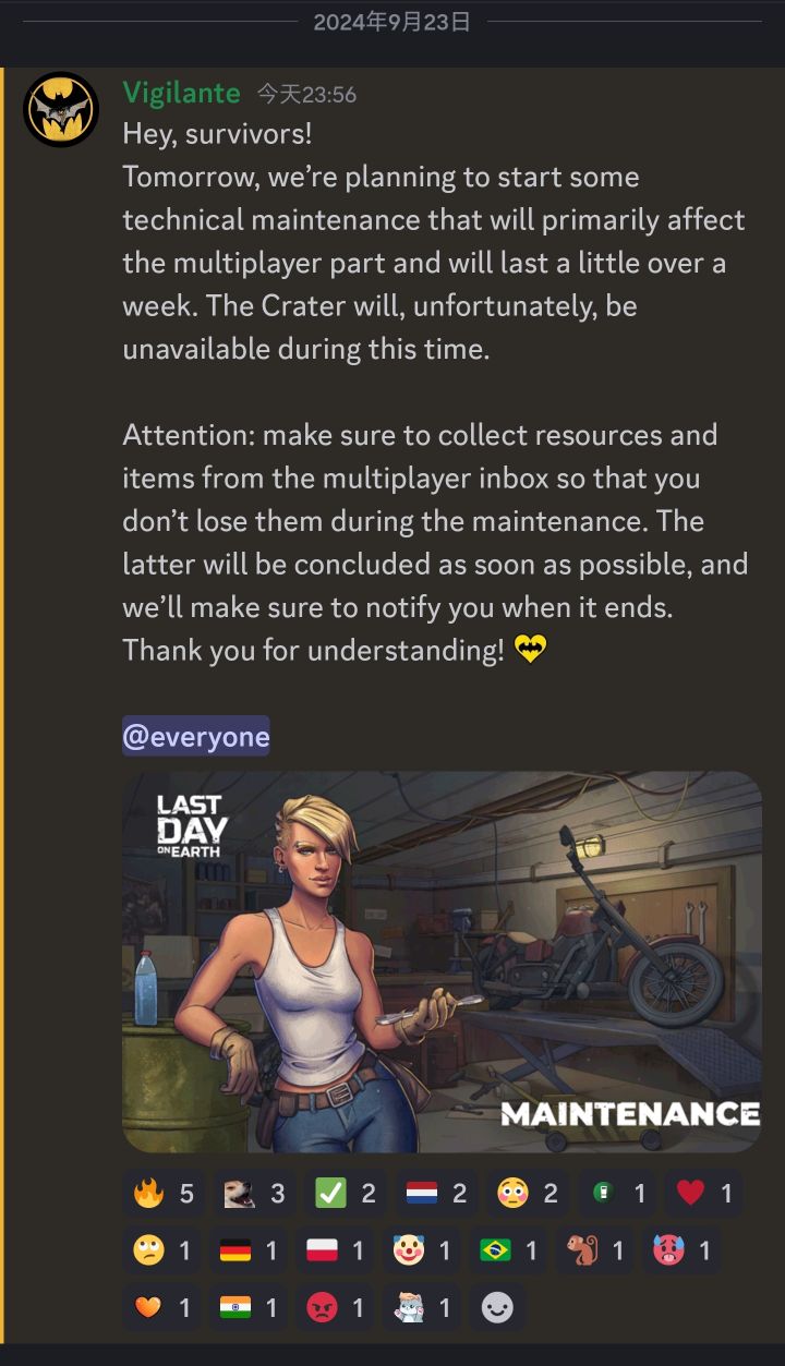嘿,幸存者!明天,我们计划开始一些技术维护,主要影响多人游戏部分,并将持续一周多一点。不幸的是,火山口在此期间将无法使用。注意:一定要从多人游戏收件箱中收集资源和项目,这样在维护过程中就不会丢失它们。后者将尽快结束,我们会确保在结束时通知您。感谢您的理解!