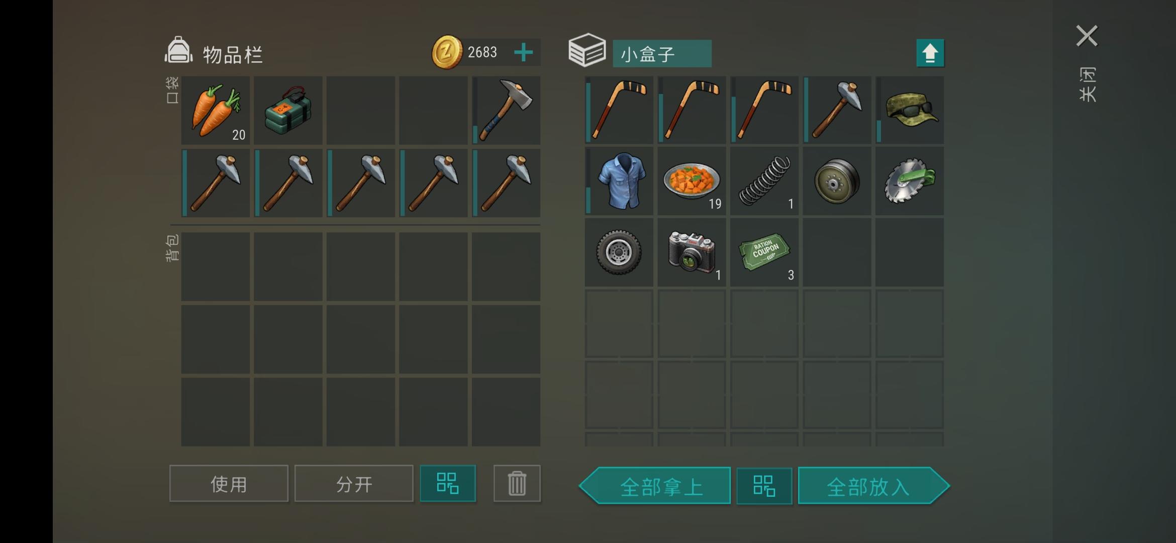 两排箱子,按顺序来非常多木头带一个c4,10把一级斧头