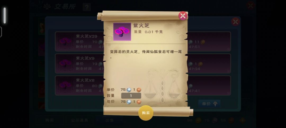 如图第一页右边第二个75银剩余时间47.24的灵芝 明明是一个 买了五六个都没买完 估计能无限买 也不像脚本自动上架呀 关键剩余时间都不变