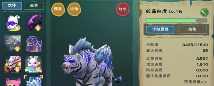创造与魔法中,皎晶白虎需要基础资质总和达到5477,并且消耗35个“皎晶白虎进阶石”,之后才能成功进化至6阶。进化至6阶的皎晶白虎,其外观呈现着白色火焰,同时自身的资质增加4%,等级上限升至70级。需要注意的是,在进阶的过程中,宠物可能会发生变异,需要将变异的宠物进行修复,之后才能继续进阶。皎晶白虎属于融合宠物,是由其它宠物通过一步一步融合而来的,首先需要用两只40级的剑齿虎合成岩虎;然后将4