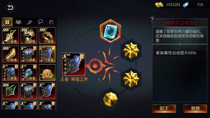 我干了几千场终于干出了一整套s++套装,这时有人会说爬塔里有更好的,这……,收藏一下也行啊,属性也不错的。如上图核心无疑是这次的必刷3核心,其中耶梦加得的属性核心最为重要,套装属性加66%,刷够四个你就毕业了。刷够四个那就是无敌的存在了,攻击力直接突破天际,秒变大罗金仙目前我只刷够了两个打算接着干几千局刷出来,我宝石还没有全部7级(我还有工作不可能随时玩只能最近抽空肝肝),但是攻击力却达到了