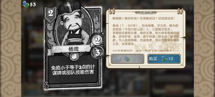 但是也存在着不足:1)存在莫名其妙的三国人物。对于三国迷来说,即使是冷门人物 我们也是倒背如流。而游戏里存在了许多莫名其妙的人物,例如 刘备军的杨戏、刘格等。让我们觉得 策划是过来搞笑的,这种牌如果多了 我们就不玩了。2)卑弥乎这个日本君主,让我们很反感。请不要恶心我们。三国的君主 还有很多,比如刘表,袁术,公孙瓒,甚至孟获 也可以。