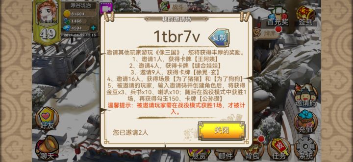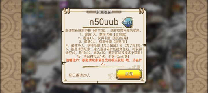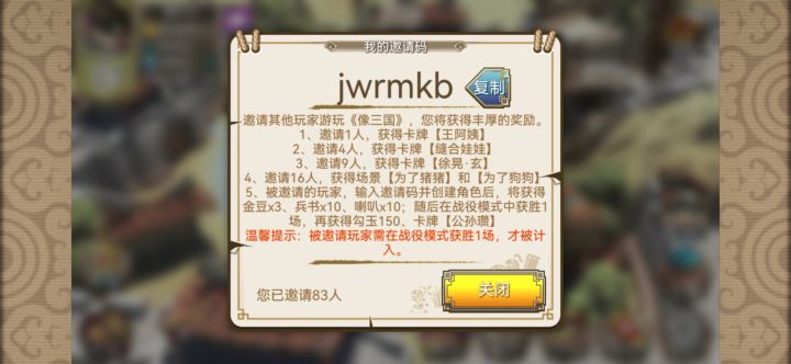 永久邀请码:jwrmkb,注册时填写领取新手大礼包(1) 参与方式和奖励:① 新玩家在创建角色时输入邀请人的六位数邀请码即可参与② 被邀请人在战役模式获胜1场,即可记录为成功邀请③ 成功邀请到1个玩家,邀请人获得卡牌【王阿姨】④ 成功邀请到4个玩家,邀请人获得卡牌【缝合娃娃】⑤ 成功邀请到9个玩家,邀请人获得卡牌【徐晃·玄】⑥ 成功邀请到16个玩家,邀请人获得场景【为了猪猪】和【为了