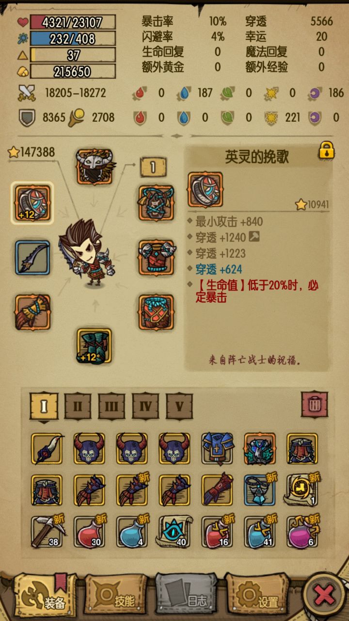 我主要讲装备的选择和卡箱子选择装备要看流派和你正在打的boss如果你是物理流,初始暴击在3以上的你就要留心,如果其他属性加的对你攻略现在的boss有帮助,这件装备你就可以留下,直接升到加五,再升没什么意义,因为很快就要换更好的装备了,记住暴击是物理流的核心,肾上腺素牛批(吼破天际)魔力流的话装备肯定是要魔力和魔法值了,疯狂刷,刷出带这两条属性的装备,提升巨大,其他跟物理流没什么不同,不过物理