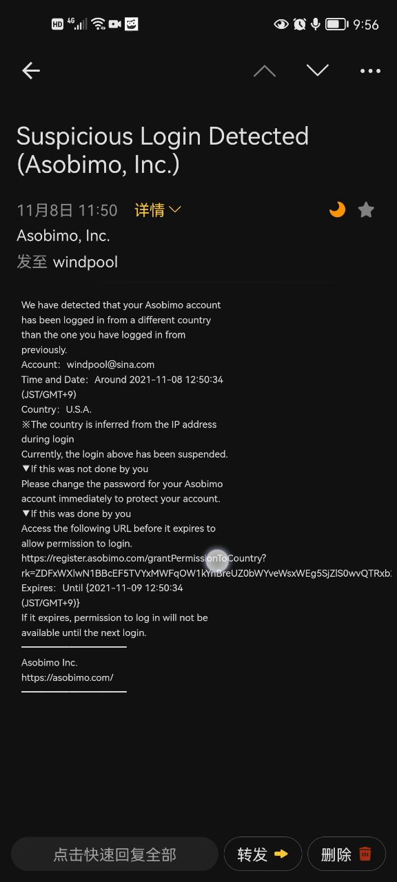 邮箱找到asobimo的邮件,打开链接如视频所示,这里不需要魔法上网,然后就完成了 这个过程就是转换ip地址,常见的就是更换加速器节点,就需要验证 视频结尾我这里是验证失败的,为什么呢 1)邮件超过一定时间后这个验证就自动视为失败 2)节点还是原来的节点(如蜜传如蜜)