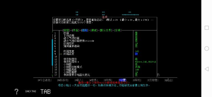 很多人反应初始的屏幕太窄了,这里我分享一下自己摸索出来的调屏数据,以达到最佳游戏体验:在设置里面的【图形】中找到【终端高度】和【终端宽度】,将其调成下图数字就可以了。最终效果是这样的: