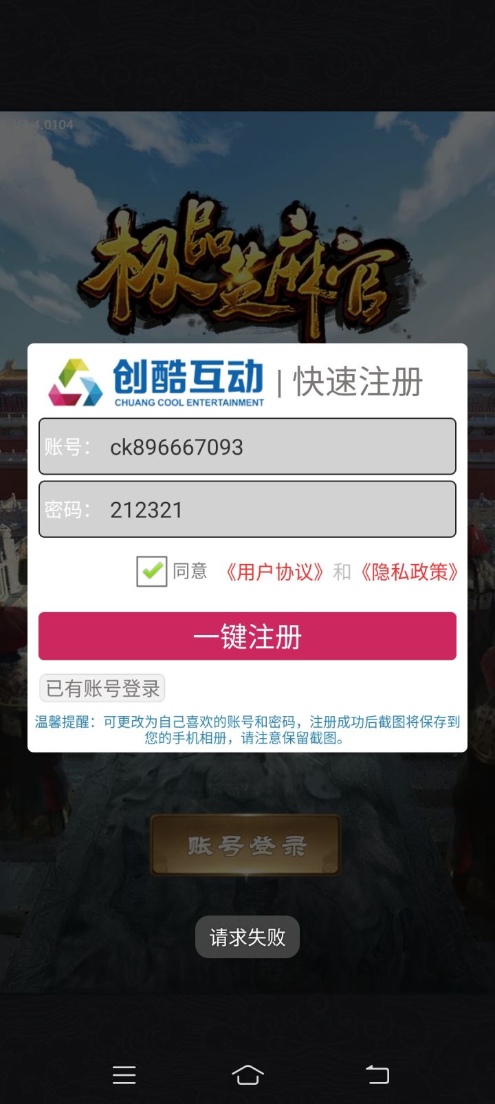 怎么点一键注册他显示请求失败呢