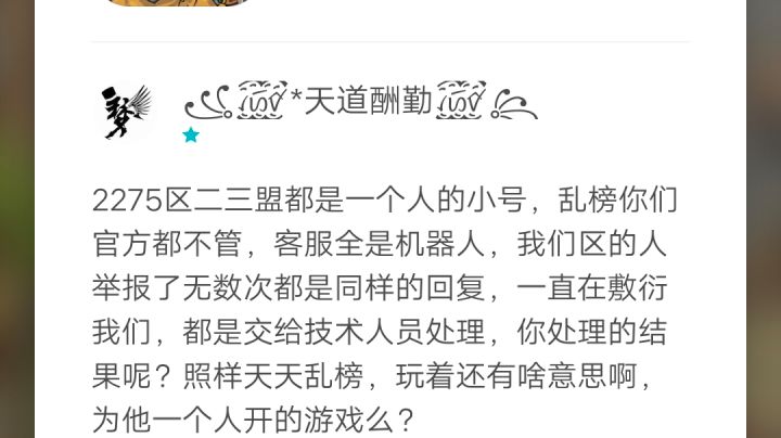 2275区乱榜官方不管,不给处理,就为2275琳琅寰宇一个人,跟他的小号开的,退钱退游,毫无游戏体验感,客服全是机器人,只会敷衍我们消费者,每天给你发网上宣传你们服务态度