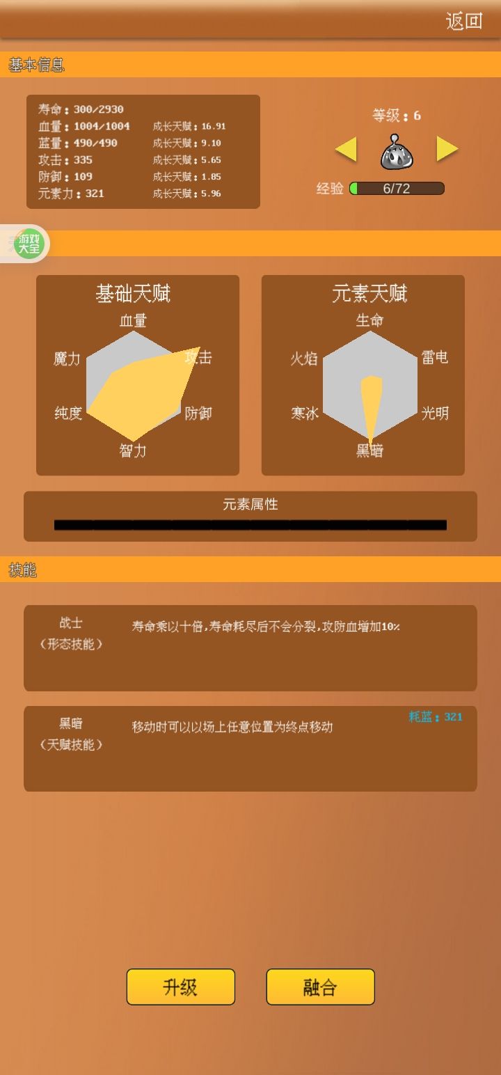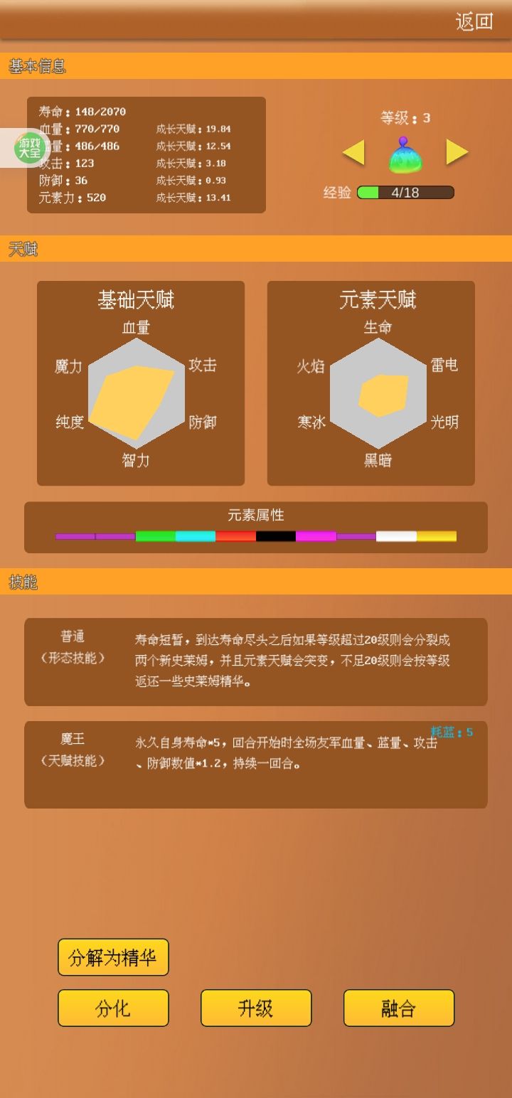 黑暗体史莱姆主扛伤/输出,绿色体扛魔法攻击,蓝色体减对方伤害,红色魔法伤害,紫色伤害反弹(配合冰更佳),魔王(输出扛伤,搭配黑暗超激发态最佳),魔王需要每一种元素达到3点也就是3种元素或一个超激发态或2种激发态。bug:(战士获得了母体的分裂技能,母体失去了分裂技能,完全废了)