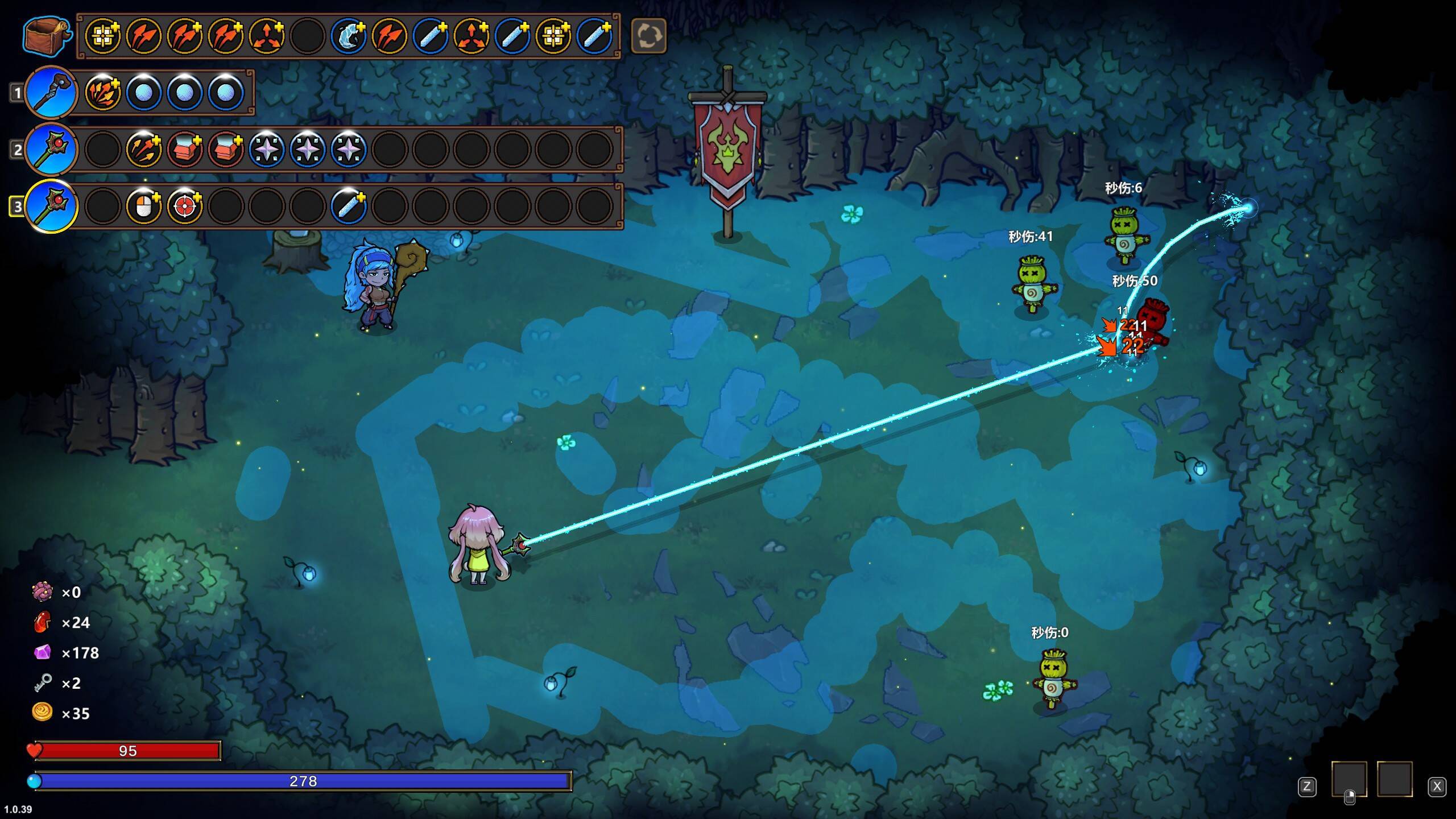 在研究过一些基本的底层逻辑设计之后,结合rogue游戏的随机性,笔者也尝试依据初始职业的特征来进行构筑随机性的削减。由于版本会赠送一个联动皮肤,其职业技能可能从根本上影响构筑。这里来看暖雪联动职业的特化构筑。其独特道具狴犴的特性是按照一定时间收回已经射出的飞剑,而飞剑本身正是本构筑的核心。一方面,飞剑不占用格子,享受所有强化的同时,会在对应法杖施法的时候追加一把飞剑射出。另一方面,飞剑的数量依