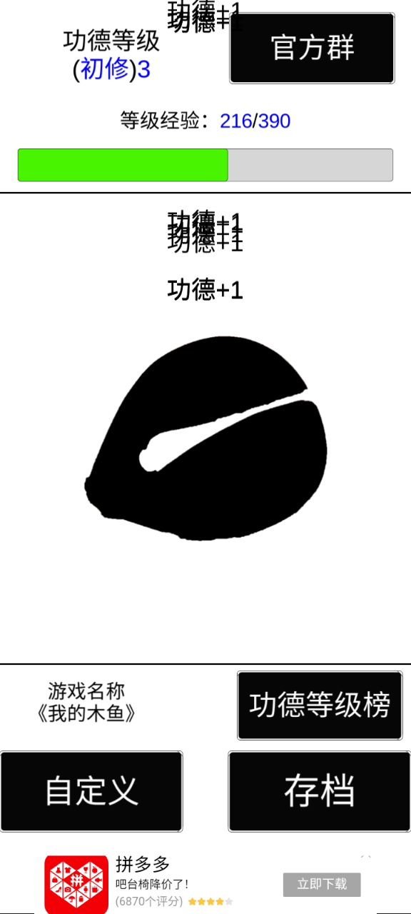 好像是最近很火的一个小游戏啊哈哈哈哈,挺好玩的,不会上瘾,挺有意思的解压方式,好喜欢这个敲木鱼的声音啊啊啊!好好听好解压的感觉,没事的时候敲一敲积点功德哈哈哈哈哈哈哈