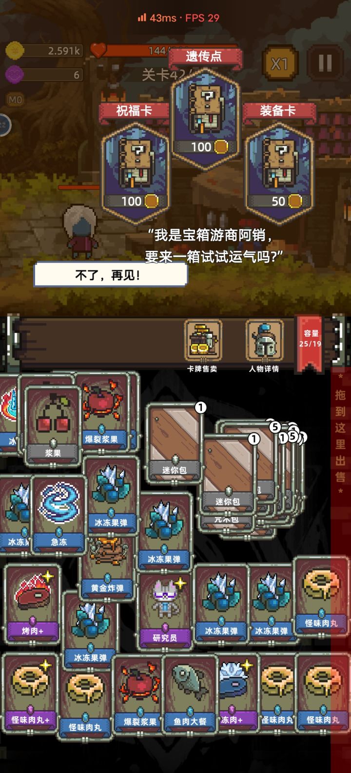 那么卡包的选择打怪会掉很多卡包,前期怪打你不疼优先做装备,那么就开元素,装备,咒术包,其他卡包先拉一边,尽量中期前做好,中期开咒术,食物包,做出高回复食物备着打后期,中间备三个状态食物,特别是鱼加扩散的备2个不然后期你可能一眨眼就无了,前期像那种斩击啊,中后期的装备多余的粉尘扩散之类的点装备售卖右边会出现一个红色售卖区往里面拖就行这样操作起来就不会那么乱了,建议售卖的东西:输出类的技能属实是没啥用,前期用不着后期刮痧,我是直接卖了的,这样能有钱买天赋点。。。。。