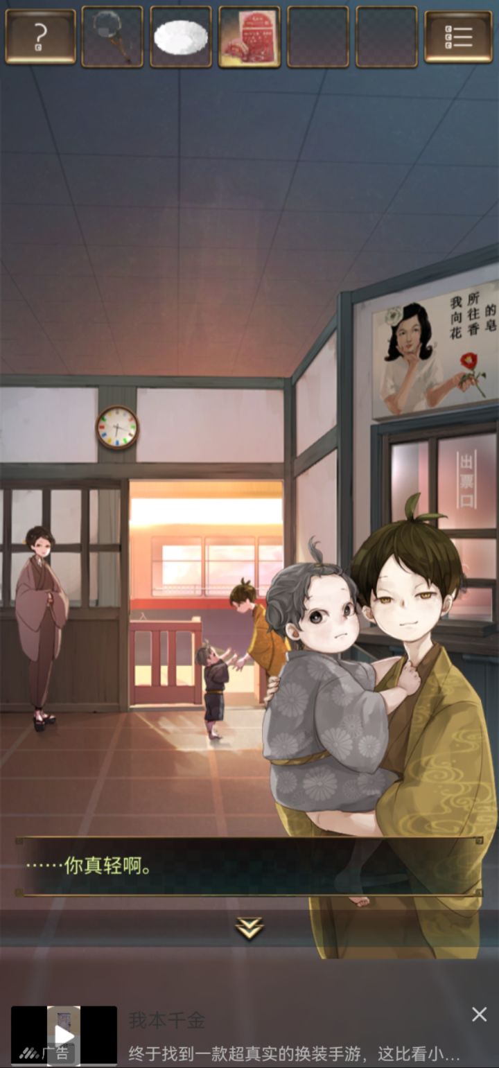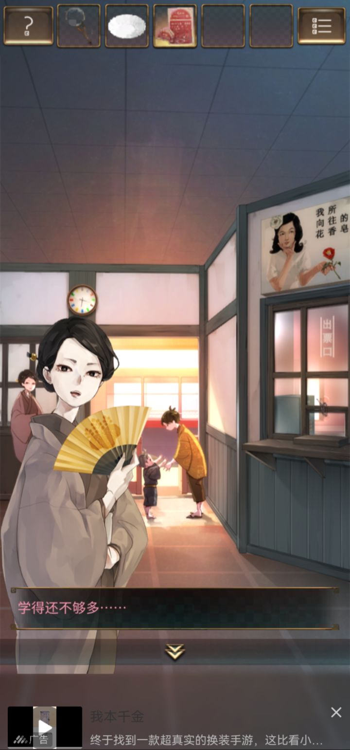 第三章(钱💰)1.(右边场景)点击出票口,获得【小盘子】2.(左边场景)点击坐垫,在左边的坐垫下获得【放大镜】3.在中间的坐垫下获得【毛巾】4.用【放大镜】查看右边坐垫上的图案,获得线索:NOPI及红色夹角5.点击热水壶,使用【毛巾】,用【小盘子】装热水6.点击窗台上的花,移开,点击查看墙上的贴纸,获得线索:粉蓝粉绿粉蓝,和人影大小7.(右边场景)点击三个客人,根据贴纸上的线索,按