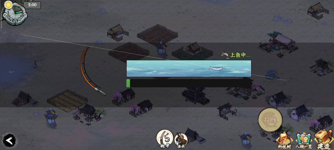 走到水边,渔具选择鱼竿和鱼饵种类(鱼饵不同钓不同种类的鱼概率不同),抛竿开始钓鱼,底下绿色的是耐力条,耐力条到右边顶部就会失败,鱼被拉到最左侧即为成功,鱼变红(挣扎)的时候不拉线(此时拉线会加快耐力条消耗),白色的时候拉线。每种鱼的红色挣扎时间和拉线时间不同。后边商会任务会再解锁两种鱼竿,一种是韧性鱼竿(耐力恢复快,适合所有鱼类,有这个就够了),一种是加固鱼竿(耐力条更长或者说拉同样的时间耐力条涨