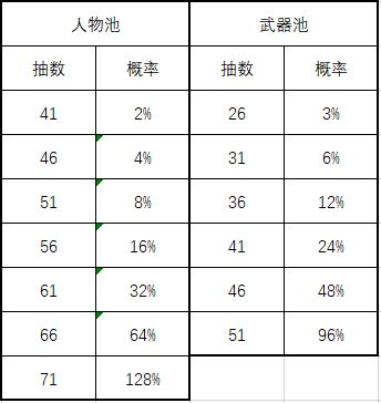 如图,人物池和武器池都是每5抽概率翻个倍。别的游戏是到一定抽数每次加概率,然后在最后保底那一抽是100%,所以保底前几抽就到90%几概率了,基本必出了,所以很少真的抽到最后一抽。但是看看贵游,保底前4抽的概率,人物64%,武器48%,这能不到最后一抽才出?随便一算,如有错误请各位大佬指正#黑色信标 #黑色信标公测