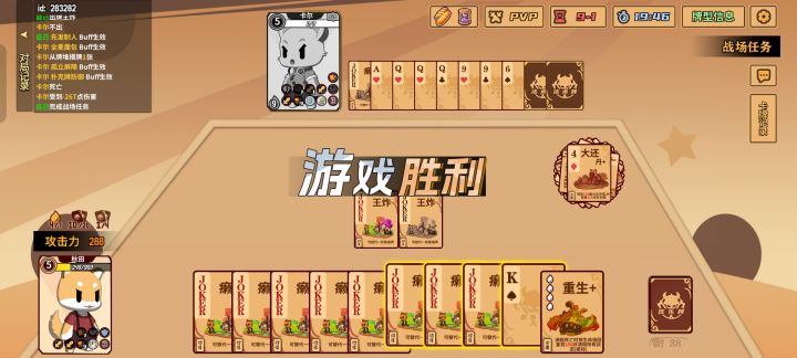 兄弟们,我玩吉吉(恶作剧之王)这角色,思路是瞅准他“每回合首次打出3张以上牌型,能加30临时攻击力”的被动,想方设法每回合凑3张以上牌打出去触发增攻。之前连着输三把,刚好不容易赢一把,这思路到底对不对呀,来大佬给瞅瞅!
