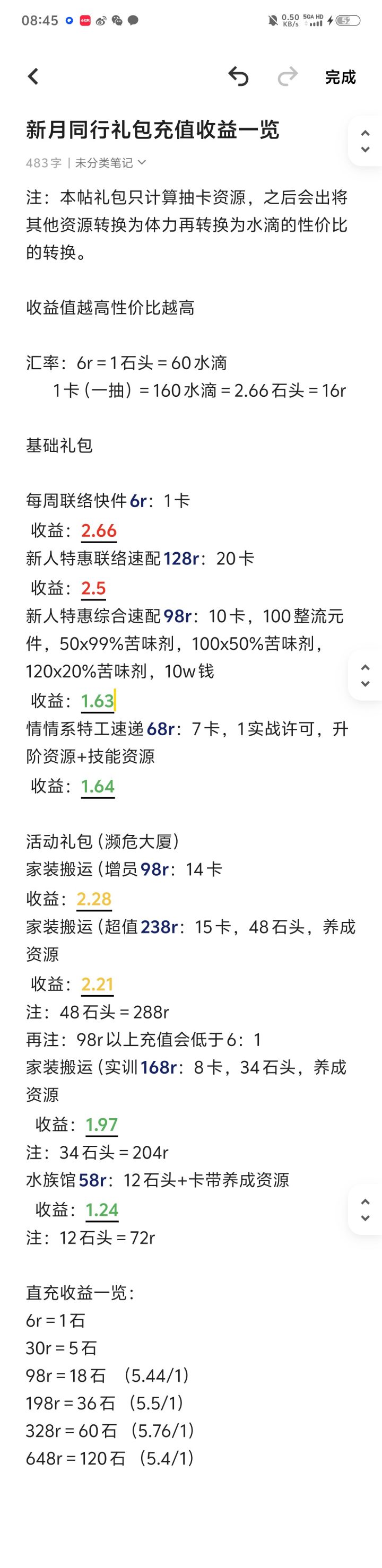 当前数据只计算抽卡价值红色最高绿色最低ps:月卡30r=3000水滴=18.75抽,性价比最高