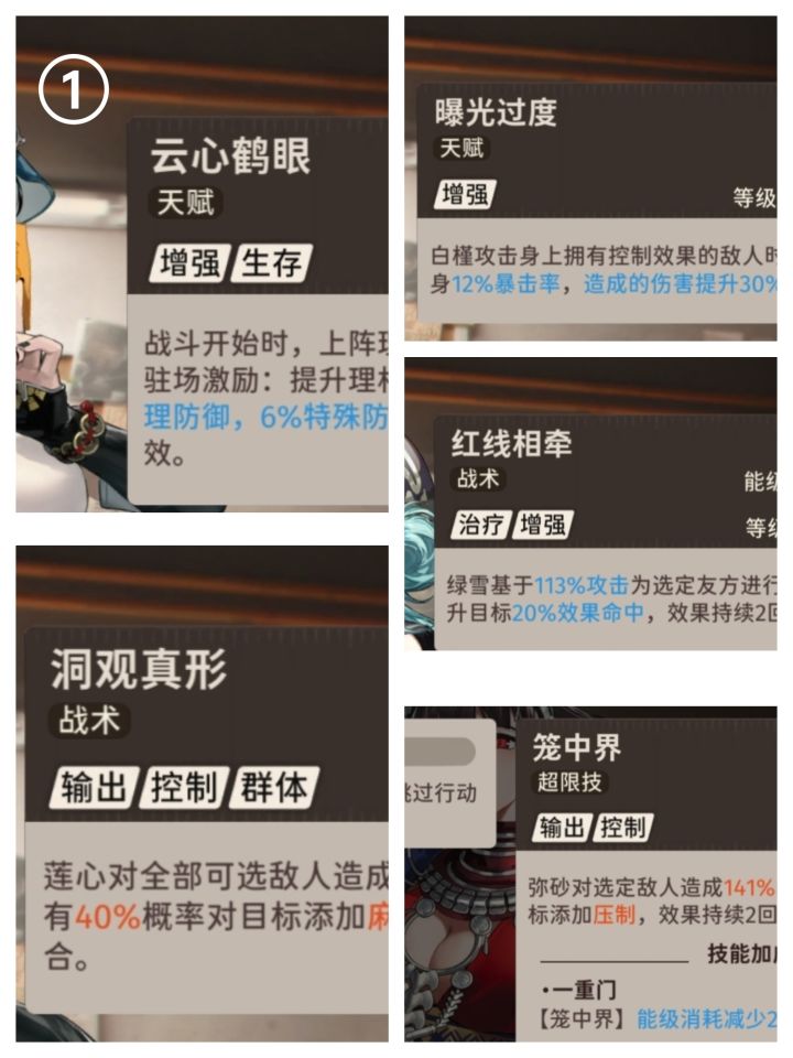 想必这几天大家也了解到各个角色的强度,今天呢,小三就来给大家分享推荐几个有趣且能战的阵容,还有一些游戏细节 NO.1:理控队>队员构成:莲心 白槿 弥砂 绿雪(原因参考图①)围绕莲心和白槿天赋聚合出的控制输出队,兼顾生存与搭配度,不遇绿职和高效果抵抗类怪能打出不同于完全直伤队的意外效果(非酋鸽鸽及紫啧慎用) NO.2:DOt队(改)>队员构成:碎银子 传影 黑桃 沐棉(原因参考图②)围