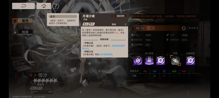 前言:如果是xp党,可以无脑入手如果是强度党的话,则需要考虑一下,因为恒沙的质变需要4命,而且技能组也有一点矛盾,强度的话,可能在五星角色左右,但是【迷宫环】可叠加减防的特殊性,应该能上到很多高难boss对应战上面。首先从恒沙的整体思路上来看,主打的是开大以后用二技能多段伤害减防打输出。【空洞恒在】【暗淡余音】这两个就一起说了普攻倍率较低,有一个百分之五十猜拳获取能量特效,对恒沙来说很需要
