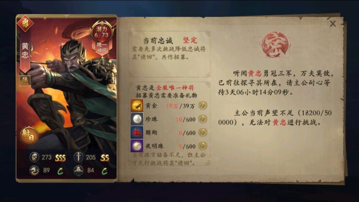 黄忠,字汉升,河南南阳人,五虎将之一。黄忠最有名的一战,是定军山之战,斩了曹操的大将夏侯渊,因功劳显赫,被刘备拜为征西将军。黄忠的生年不详,但关羽曾说:大丈夫终不与老兵同列。因此推断黄忠年龄较大,在各类艺术创作中也一般为老年形象。在《锦绣江山》中,黄忠保持了老当益壮的形象和属性,能带能打,黄忠是全服唯一神将,一旦招降了就会成为该君主独有的将领。【传记】:原为刘表部下,后归刘备。被称为蜀汉五虎